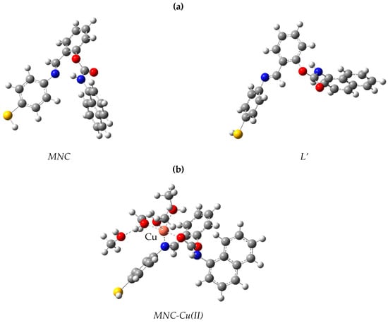 Ligand conformers for L and L’ are presented in Figure 10a. The L conformer is more stable than the L’ structure by 3.31 kcal/mol (Table 2). The theoretical study of the ligand’s electronic structure alone will focus on the most stable conformer, L. The copper complex optimized structure (Cu-L) is represented in Figure 10b. In this figure, we see that the copper center in the complex is five coordinated to the ligand L through one nitrogen atom and one oxygen atom. The bond length of Cu-N is 2.032 Å, and the bond length of Cu-O is 1.95 Å in the optimized structure. Thus, the ligand L can accommodate the cation Cu2+ by forming bonds with one nitrogen and one oxygen. The likely transitions in such chromophores were identified using time-dependent DFT Numerical simulations. Figure 11 depicts the border molecular orbitals of MNC and Cu-LMNC-Cu(II). The data of electronic transitions, wavelength, and oscillator strength from TDDFT calculations are found in Table 3.