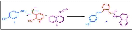 Our approach started with synthesizing Schiff base carbamate via the condensation of equimolar amount 4-mercaptoaniline 1 and salicylaldehyde 2 in anhydrous boiling dichloromethane. After 3 h of contact, one equivalent of naphtylisocyanate 3 was added. The reaction afforded the corresponding Schiff base carbamate 4 at 85 % yield (Scheme 1).
