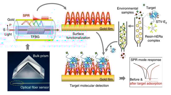 Plasmonic gold film-coated TFBG-based SPR biosensor for ultrasensitive estrogen (EE) detection. Reproduced from [34].