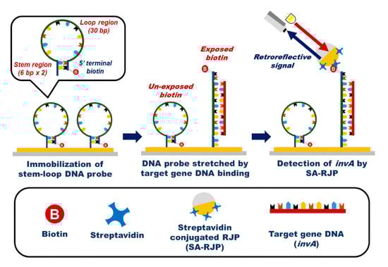 - Kim, D.W.; Chun, H.J.; Kim, J.H.; Yoon, H.; Yoon, H.C. A Non-Spectroscopic Optical Biosensor for the Detection of Pathogenic Salmonella Typhimurium Based on a Stem-Loop DNA Probe and Retro-Reflective Signaling. Nano Converg. 2019, 6, 16. [Google Scholar] [CrossRef]