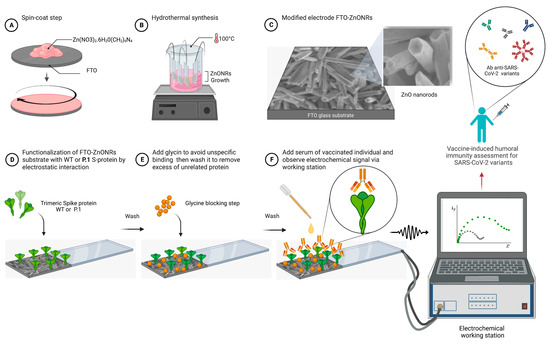 Fluorine-doped and electrochemical sensing layers were performed as previously described by our group [16]. In brief, solutions of Zn(NO3)2 (20 µL, 0.5 mol L−1) and HMT (20 µL, 0.5 mol L−1) were applied onto the FTO substrate and spun at a controlled speed to create a thin and organic homogeneous film (Figure 1A). The ZnONRs films were grown hydrothermally by soaking the modified substrates in a mixture of 1:1 (v/v) of Zn(NO3)2 (0.1 mol L−1) and HMT (0.1 mol L−1) (Figure 1B). Hydrothermal growth was performed at 100 °C for 4 h in a sealed beaker to generate the modified electrode called FTO-ZnONRs (Figure 1C). Next, the FTO-ZnONRs electrode was rinsed with phosphate-buffer saline (PBS) to generate a hydrophilic surface; then, a drop containing the volume of 20 μL of SARS-CoV-2 recombinant spike protein from WT or P.1 strains, 4 μg mL−1 diluted in PBS (pH 7.4) was applied onto the FTO-ZnONRs surface and left incubated for 5 h for adsorption (Figure 1D). Then ZnONRs surface was rinsed to remove any unbound recombinant protein and dried. To reduce non-specific binding, glycine solution (10 μmol L−1) was added; a volume of 20 μL was placed and left incubating for 30 min, and the device was again washed and dried (Figure 1E). Glycine was used as an agent to prevent non-specific antibody binding on the device surface and to have a low dielectric constant [18,19,20,21]. In previous work, we have demonstrated that the glycine coating works directly on the ZnO nanorods since it has a good affinity for carboxylic groups [22]. A volume of 20 μL of serum sample diluted 1:500 (v/v) in PBS (pH 7.4) was incubated for 1 h on the electrode surface, rinsed to wash away the unbound material (non-specific antibodies), and subsequently dried. Finally, the electrochemical signal is acquired through an electrochemical working station for humoral immunity assessment (Figure 1F).
