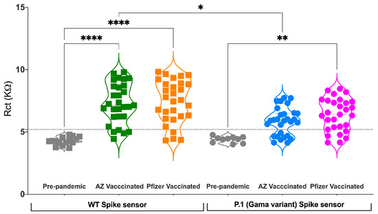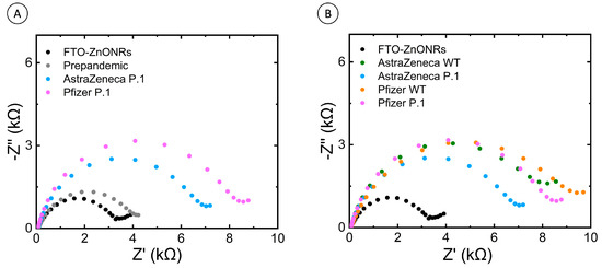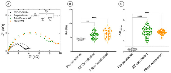To further explore the applicability of the developed ZnO electrochemical immunosensor to detect antibodies against the wild-type spike protein [16], we evaluated the induced anti-S antibody responses of 29 serum samples from individuals vaccinated with ChAdOx1-S (Oxford–AstraZeneca), an adenovirus-based vaccine, and 29 serum samples from individuals vaccinated with BNT162b2 (Pfizer–BioNTech), an mRNA vaccine, using the electrochemical impedance spectroscopy (EIS) technique. Impedance variations come from changes in the physical interfacial properties since most of the biological molecules adsorbed by the electrochemical surface have an insulating nature, promoting increased electrical impedance [23,24].