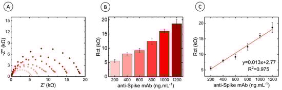 Calibration studies using an anti-S monoclonal antibody (mAb) were performed to set up the spike P.1 (Gamma variant) immunosensor and ensure a measurable and specific proportional electrical signal. The calibration curve was made to measure the immunosensor electrochemical behavior response to the binding detection of the anti-S mAb (anti-SARS-CoV-2 spike protein—similar to 240C) in the concentration range of 200 to 1200 ng·mL−1. Figure 4A shows the EIS plots obtained after mAb incubation, and the results show that the semicircle radius increased with the increase in mAb concentration. Figure 4B shows the histogram of the EIS measurements for each concentration, calculated from three individual immunosensors. The Rct values were plotted against the mAb concentration (Figure 4C). The analytical curve showed a good linear regression (R2 = 0.975), a limit of detection (LOD) of 52.55 ng·mL−1 for mAb detection, and a limit of quantification (LOQ) of 159.23 ng·mL−1. Our previous studies (carried out with the spike WT immunosensor) [16] obtained a LOD of 19.34 ng·mL−1 for mAb detection and a LOQ of 58.62 ng·mL−1. This performance demonstrates that the immunosensor is suitable for detecting anti-SARS-CoV-2 spike WT and anti-SARS-CoV-2 spike P.1 (Gamma variant) antibodies. The determined LOD values are comparable with other immunoassays and, in some cases, show higher sensitivity (Table 1). Nevertheless, the reported device is easier to fabricate, cheaper, and portable, factors that emphasize its utility.