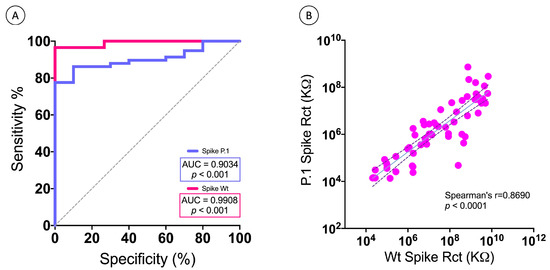 Comparison between the detection accuracy of anti-S antibodies by the developed FTO-ZnONRs/spike WT and the FTO-ZnONRs/spike P.1 immunosensors. (A) Receiver Operator Characteristic (ROC) curve comparison between the WT and P.1 immunosensors. (B) Correlation between the WT and P.1 immunosensors. Electrolyte: solution of 5 mmol L−1 K4Fe(CN)6 /K3Fe(CN)6 in 0.1 mol L−1 KCl.
