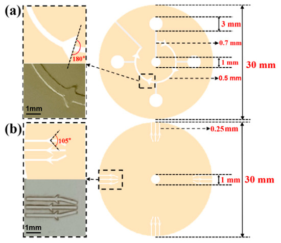 (a) The design drawing and size of sweat flow layer with CBV#1. The angle of CBV#1 at inlet is 180. The inlet of CBV#1 is a curved microchannel with 500 μm width and 450 μm height. (b) The design drawing and size of spiracle layer with CBV#2. The angle of CBV#2 at inlet is 105°. The inlet of CBV#2 is a rectangular microchannel with 250 μm width and 50 μm height.