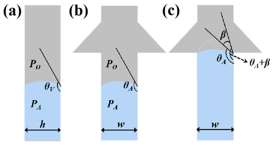 where PA is the pressure from the inside flexure liquid level, PO is the pressure from the outside flexure liquid level, and σ is the coefficient of the surface tension [17]. θA and θV represent the contact angle of the liquid with the side wall and the top/bottom walls, respectively. w and h are the width and the height of the microchannel, respectively. As the liquid flows into CBV#1, the width of the microchannel spreads out suddenly, and the three-phase contact line of the liquid stops immediately [18]. Until the contact angle increases from θA to θA+β (Figure 3c), the liquid can enter through CBV#1 [19]. The BP of the liquid at the entrance is [16]