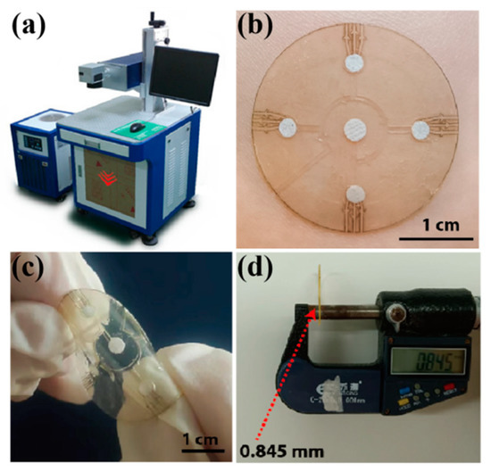 (a) The laser-cutting system for microfluidic patch preparation. (b) A physical picture of the microfluidic patch on a volunteer’s forearm. The patch is flexible (c) and thin, with a thickness of about 0.85 mm (d).