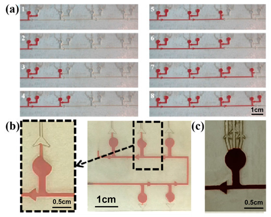 In order to realize the chronological collection of liquid in the microfluidic patch, two different types of CBVs (CBV#1 and CBV#2) are designed. Then, red dye is uniformly injected into the microchannels with an injection pump at an injection rate of 1 μm/mm. When the red dye liquid enters the microreservoir, it flows into the next set of microreservoirs after filling the secondary branch, as shown in Figure 6a, indicating the effectiveness of CBV#1. However, in some cases, the liquid preferentially fills one side of the microreservoir, and sweat blocks the spiracle valve (CBV#2), as shown in Figure 6b, so the residual air in the microreservoir cannot be vented out; therefore, sweat will not fill the microreservoir. To solve this problem, we design three parallel spiracle valves (CBV#2), ensuring that the air can be vented out thoroughly, as shown in Figure 6c.