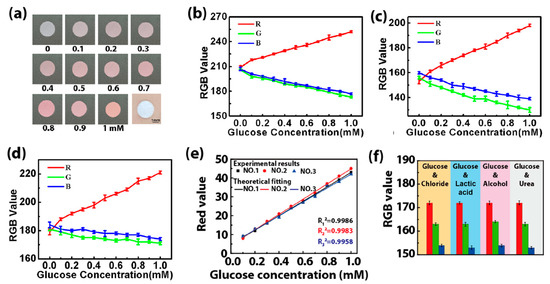 The colorimetric method is selected to detect the glucose concentration in sweat via an enzyme-based reagent [22]. Catalyzed by GOD, glucose is oxidized to gluconic acid, which couples with oxygen to produce H2O2. Then, the produced H2O2 oxidizes the colorless o-dianisidine to generate red-colored oxidized o-dianisidine. The presence of glucose brings out the red color of the GOD-peroxidase-o-dianisidine system [23]. Therefore, the amount of H2O2 generated in the initial reaction is directly proportional to the glucose concentration [24]. The color markers consisting of GOD and POD in the microreservoir have a sensitive color reaction to H2O2 with different concentrations, presenting an obvious color change related to glucose concentration. Figure 8a shows images of color markers with different concentrations of the glucose solution dropped onto them, presenting large differences in the color value. This indicates that the color markers can distinguish and determine the concentration of glucose in sweat with a color picker. When the color markers with different concentrations of the glucose solution (0.1–1 mM) are placed under three different kinds of light (2.5 W white light, 5 W white light and 3 W yellow light), the RGB value of the color response to glucose is found to be linear with the glucose concentration for these three different kinds of light (Figure 8b–d). The linear fitting of their RGB values shows that the R value has a high fitting degree (Figure 8e), which can be used as the final reference curve for the colorimetric result [25,26]. We also study the selectivity of the color markers for glucose by performing four sets of contrast tests in which chloride, lactic acid, alcohol and urea solutions with the same concentrations (0.3 mM) were added to a 0.3 mM glucose solution. The RGB value is almost constant (Figure 8f), proving that the color marker is highly selective for glucose, and it can effectively prevent interference from other biomarkers in sweat.