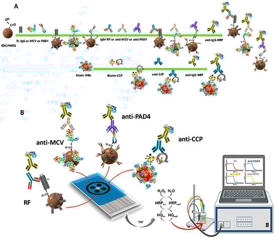 (A) Scheme of the steps for the preparation of HRP-IgM-RF-Fc(IgG)-cMBs, HRP-IgG-anti-PAD4-PAD4-cMBs, HRP-IgG-anti-MCV-MCV-cMBs, and HRP-IgG-anti-CCP-CCP-Biotin-Neutr-MBs magnetic immunoconjugates and (B) their capture on the SPC4E, as well as the reactions involved in the simultaneous amperometric detection.