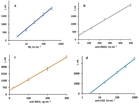 The calibration plots constructed with the quadruple platform, using the optimized working conditions for each autoantibody, are shown in Figure 2. As expected, according to the sandwich-type configuration of the immunoassays, the recorded currents were directly proportional to the concentration of each antibody. Linear ranges for anti-PAD4 and anti-MCV and semilogarithmic plots for RF and anti-CCP were obtained with the parameters summarized in Table 2.