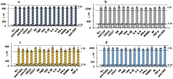 Amperometric measurements obtained with the quadruple bioplatform for 0 (light bars) and (a) 30 IU mL−1 RF (dark blue); (b) 250 IU mL−1 anti-PAD4 (dark gray); (c) 20 IU mL−1 anti-MCV (dark yellow), or (d) 20 IU mL−1 anti-CCP (blue) prepared in the absence and in the presence of 100 IU mL−1 RF (b–d); 250 IU mL−1 anti-PAD4 (a,c,d); 40 ng mL−1 anti-MCV (a,b,d), 100 IU mL−1 anti-CCP (a–c), and 50 ng mL−1 CXCL4, 50 ng mL−1 CXCL7, 5 ng mL−1 HB, 1 mg mL−1 hIgG, 50 pg mL−1 HSA, 50 pg mL−1 IL-1β, 300 pg mL−1 IL-6, 300 pg mL−1 IL-8, 100 pg mL−1 IFN-γ, 50 pg mL−1 RANKL, 100 IU mL−1 RF, or 200 pg mL−1 TNF-α. Error bars are estimated as three times the standard deviation value of three replicates.