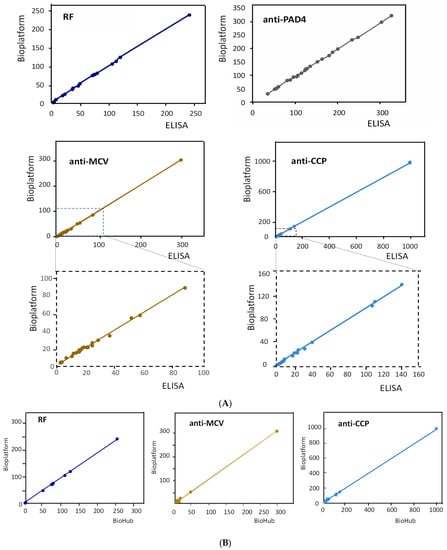 Correlation graphs of the results obtained for the determination of the target autoantibodies with the bioplatform and the individual ELISA kits (A) and the contents certified by Bio Hub® (B).