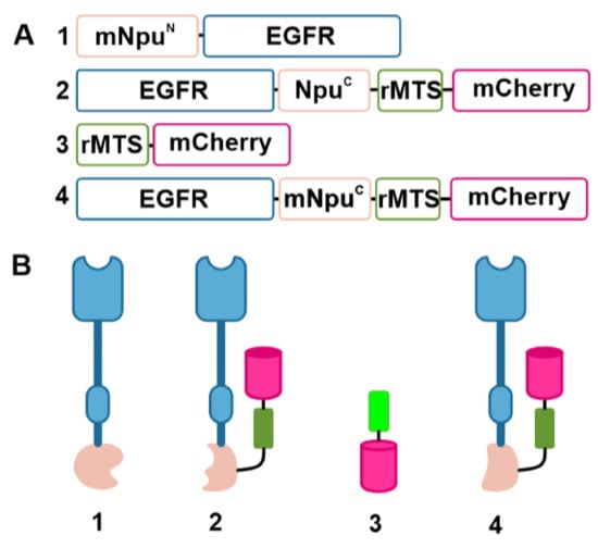 The fusion proteins used in this study. (A) Domain architecture of the DNA constructs and (B) a schematic illustration of fusion proteins 1, 2, 3, and 4. EGFR, epidermal growth factor receptor; rMTS, recombinant and modified mitochondrial targeting sequence; mNpuN, the C1A mutant N-terminal domain of N. punctiforme (Npu) intein; NpuC, the C-terminal domain of Npu intein; mNpuC, the N36A mutant of C-terminal domain of Npu intein.