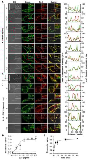 Performance analysis of sensor cells at different EGF-dose and EGF-treatment time. Fluorescence images of (A) sensor cells, expressing fusion proteins 1 and 2, treated with various concentrations of EGF (scale bar = 20 μm) and (B) mock sensor cells, containing fusion proteins 1 and 4, challenged with EGF (10 ng/mL) (scale bar = 20 μm). Fluorescence translocation was observed from functioning sensor cells treated with EGF at concentrations higher than 0.1 ng/mL. (C) Fluorescence images of sensor cells treated with EGF for various time points. The minimum response time was 5 min. Plots of the red and green fluorescence signal co-localization versus (D) varying EGF concentration or (E) varying exposure time. Approximately 10 to 20 cells were analyzed in each experiment and the entire cell area was analyzed for colocalization. Co-localization was quantified by using Pearson’s correlation through the JaCoP Plug-in on ImageJ. The R value was scored from 1 to −1, with 1 standing for complete positive correlation and −1 for a negative correlation, with zero standing for no correlation.
