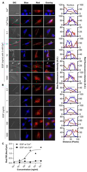 Detection of EGF-mediated Ca2+ signaling using the sensor cells. (A) Fluorescence images of Ca2+-detecting sensor cells treated with 3 mM Ca2+ (row 1), 3 mM CaCl2 with 20 nM ionomycin (row 2), or varying concentrations of EGF (ranging from 0.1 ng/mL to 1000 ng/mL) in the presence of external Ca2+ (rows 3–7). (B) Fluorescence images of Ca2+-detecting sensor cells treated with varying concentrations of EGF (ranging from 0.1 ng/mL to 1000 ng/mL) in the absence of Ca2+ (rows 1–5). The nucleus was stained with Hoechst (blue) (scale bar = 20 µm). EGF-induced Ca2+ signaling was observed only in the presence of external Ca2+. (C) Plot of red fluorescence intensity ratio in nucleus/cytoplasm at different EGF concentration in the presence and absence of Ca2+.