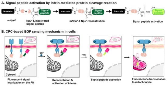 A schematic representation of epidermal growth factor (EGF)-detection mechanism in sensor cells. (A) The general concept of signal peptide activation via the intein-mediated cleavage reaction. (B) Design and working mechanisms of conditional protein cleavage (CPC)-based EGF sensing in live cells. EGF triggers split-intein reconstitution and activation. The split intein-mediated CPC reaction is used to cleave and thereby activate the signal peptide. Finally, fluorescent reporter mCherry is translocated to the mitochondria for reporting the presence of target molecule EGF.