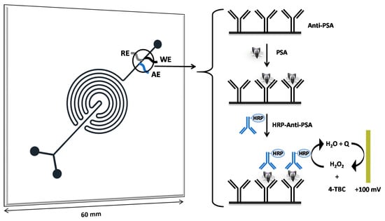 The Gleason score establishes the proper risk assessment and treatment selection through tissue biopsy []. Other non-invasive procedures are used for diagnosing and monitoring PC patients, including the Ki67 score, image analysis, and urine and blood biomarkers determination []. PSA is one the most important biomarkers for PC. This biomarker is a glycoprotein expressed in normal and cancerous prostate tissue. Values of PSA greater than 4 ng mL−1 are considered as a strong indicator of PC []. Serum PSA levels can change with age as well as non-PC related causes, such as urinary tract infections and medication [,]. The gold standard technique for PC diagnosis is based on colorimetric immunoassays (ELISA kit) for PSA quantification in serum samples, specific digital imaging studies (transrectal ultrasound guided prostate biopsy) and clinical medical expertise []. However, conventional ELISA methods are complicated, time consuming, expensive and require trained personnel, which restricts their use outside the laboratory, and therefore their portability. In this sense, a microfluidic immunosensor device that operates with a small sample and reagent volumes and reduces medical costs can be very interesting as an analytical tool for PC diagnosis and prognosis.