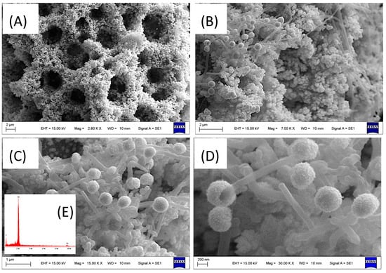 The CNF/GNP composite was morphologically characterized by SEM at several magnifications. Figure 2A shows a characteristically uniform gold nanoporous honeycomb-like image. Moreover, at higher magnifications, the GNP dendritic structure and the CNF interspersed in the gold by in situ co-deposition (Figure 2B,C) are observed. The electrode surface shows structural defects because the carbon nanofibers form a network with the dendritic gold, as shown in a magnified image (Figure 2D). In addition, fungi-like formations with nanoporous gold spheres at the extremities of carbon nanofibers can be observed.