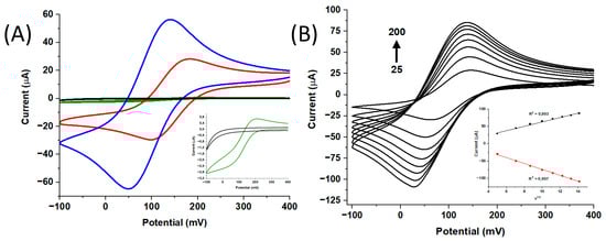 In addition, the study of the scan rate influence on the peak current was performed for the CNF/GNP/Pt electrode in a 5 mmol L−1 [Fe(CN)6]−3 solution from +400 to −100 mV (Figure 3B). The experiments were carried out using a 25 to 200 mV s−1 scan rate. A linear relationship between both anodic and cathodic peak current values and the scan rate square root was observed, confirming that the [Fe(CN)6]−3 electrochemical behavior at the CNFs/GNP/Pt composite is a diffusion-controlled process.