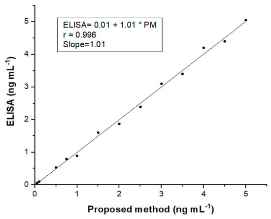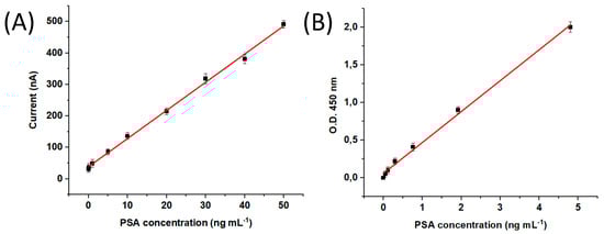 The quantification of the PSA cancer biomarker was performed under the optimized parameters, and the results were analyzed in comparison with the commercial ELISA kit. The PSA calibration curve was constructed using 0.01 to 100 ng mL−1 standard solutions. A linear relationship was observed from 0.01 to 50 ng mL−1, according to the I (nA) = 38.57 + 8.95 CPSA linear regression equation, with a R = 0.998 (Figure 4A). The commercial ELISA kit showed a linear relationship from 0.05 to 5 ng mL−1, according to the A (O.D.) = 0.05 + 0.41 CPSA equation with a R = 0.996 (Figure 4B). The coefficients of variation (CV%) for the 10 ng mL−1 PSA standard solution were 3.85% and 6.45% (n = 5), and the limits of detection (LOD) were 5 and 45 pg mL−1 for the microfluidic immunosensor and the ELISA, respectively (IUPAC recommendations).