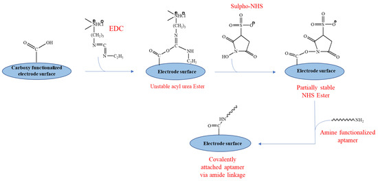Aptamer immobilization via direct attachment to the gold surface involves modification of aptamer via thiol group (-SH), sulfides (R–S–R), and disulfides (R–S–S–R) which exhibit significant assimilation onto metal surfaces, such as silver, gold, copper or platinum. These sulfur clusters adsorb impulsively onto the metal surface, generating a stable mono-molecular layer known as the self-assembled monolayer (SAM). Further, the reinforcement of immobilized aptamers with mercaptohexanol (MCH) helps in displacing the non-specifically adsorbed portions of the aptamers and confirms their upright alignment []. The covalent binding of the aptamer is performed via the formation of resonance-stabilized amide linkage with the electrode surface. In this process, functional groups, such as−NH2, −OH, and −COOH, are incorporated onto the surface of an electrode. This functional group interacts with a customized aptamer that has a corresponding functional group. The most frequently used approach is a carbodiimide-mediated process that employs the reagents EDC and NHS for linking the aptamer to the surface of the electrode via an amide bond (Figure 3) []. In comparison to the conventional EDC/NHS coupling, an amine coupling mechanism using cysteamine/glutaraldehyde is extensively used. Initially, cysteamine forms a SAM by binding to the electrode through its thiol groups, onto which glutaraldehyde attaches to generate aldehyde groups for the subsequent binding of aminated molecules []. By using diazonium salts, covalent surface modifications of graphene-based materials are easily accomplished as they permit the addition of several chemical groups, such as−B(OH)2, −COOH, and −C≡CH. Following the release of N2 molecules and the formation of radicals, diazonium salts form covalent bonds with the sp2 hybridized carbon lattice atoms of graphene oxide films []. Aptamers can also be immobilized using non-covalent interactions between avidin (or its derivatives) and biotin. In this method, a biotinylated aptamer can be immobilized on the surface coated with avidin or its derivatives (neutravidin and streptavidin) via noncovalent interactions [].