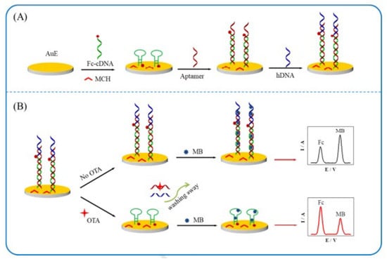 Schematic representation of the fabrication and detection process of the aptasensor. (A) design of aptasensor by stepwise addition of Fc-cDNA, OTA aptamer and hDNA on Au electrode (B) special affinity for OTA caused dissociation of aptamer and formation of hairpin structure. Reproduced from []. Copyright 2020 Elsevier. hDNA: helper DNA, dsDNA: double-stranded DNA, cDNA: complementary DNA, MB: methylene blue; Fc-DNA: Ferrocene-labeled complementary DNA.