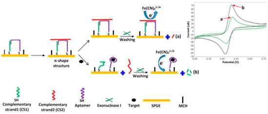 A novel electrochemical aptamer-based sensor having aptamer-complementary strands of aptamer (CSs) conjugate and exonuclease I (Exo I) was reported by Abnous et al. [] (Figure 6). The electrochemical biosensor used the π-shaped structure of the Aptamer–CSs couple as a double-layered physical barricade to prevent the redox mediator [Fe (CN)6]3−/4− from entering the AuE and Exo I-aided signal amplification. Without incorporating AFB1, the π-shaped structure on AuE and major sequences remained unaffected by Exo I. Therefore, [Fe (CN)6]3−/4− had inadequate access to the electrode surface, resulting in a poor electrochemical signal (Figure 6a). When AFB1 was present, aptamer interacted with it and was removed from the complimentary strands (CS1 and CS2). The π-shaped structure was, therefore, disassembled (Figure 6b). The inclusion of Exo I to the electrode surface aided in the digestion of CS1 on the electrode surface, and thus, [Fe (CN)6]3−/4− gained greater contact with the electrode surface, which further resulted in strong current signals. The applicability of the designed aptasensor was also verified by measuring AFB1 levels in human blood and grape juice samples.