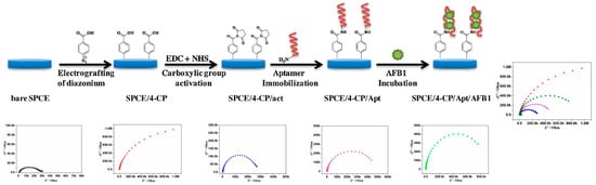 Goud et al. [] designed and prepared a disposable and portable label-free electrochemical aptasensor (5′-TGGGGTTTTGGTGGCGGGTGGTGTACGGGCGAGGG-3′) for the efficient detection of AFB1 in alcoholic beverages. The detection of AFB1 was based on specific identification by the compact aptamer monolayer bound covalently on SPCE via diazonium coupling and EDC/NHS reaction chemistry, followed by characterization with CV and EIS (Figure 8). During the whole analytical procedure, pH was set to 7.4 at room temperature with incubation durations ranging from 10–320 min. This method exhibited several advantages, including increased surface stability and ease of formation, and it was further applied for the detection of AFB1 in alcoholic beverages with a recovery rate of 92 to 102%.
