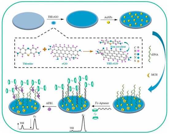The surface of reduced graphene oxide was coated with platinum nanoparticles to prepare 5,10,15,20-tetraphenyl-21H,23H-porphine cobalt flat, which was modified with rabbit anti-AFB1 monoclonal antibody to identify AFB1 effectively in bulk samples of peanuts []. This method enabled the selective and efficient detection of AFB1 (5.0 pg/mL), which demonstrated the monitoring of AFB1 in samples of food with accuracy and great precision. The same is true for the assembly of pyrrolepropylic acid (PPa) and polypyrrole (PPy) molecules on reduced graphene oxide, which were then used as effective electrochemical devices for the sensing of AFB1 []. Through the -COOH group of PPa, the anti-aflatoxin B1 antibody joined covalently to the functionalized reduced graphene oxide, and the presence of PPy improved the detector’s stability and electroactivity stability. The created impedimetric immunosensor was used with great sensitivity and particularity in spiked corn samples to analyze aflatoxin B1. Thionine-derivatized reduced graphene oxide (THI-rGO) has been reported as a reference signal generator to analyze aflatoxin B1. The working electrode was a customized GCE, with Pt wire and an Ag/AgCl electrode serving as the counter electrode and reference electrode, respectively. The ratio of current to intensity was utilized as a signal to detect AFB1 because when AFB1 was present, the Fc-apt-AFB1 couple was released from the electrode surface, causing a drop in impedance and a rise in ITHI (Figure 9) [].