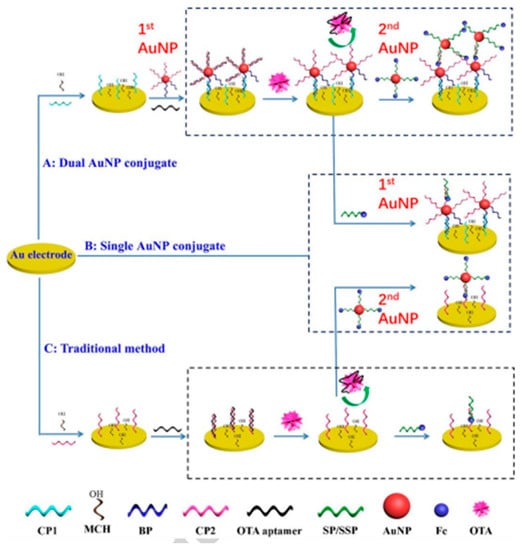 Schematic diagram of the (A) Dual AuNP conjugates, (B) Single AuNP conjugates, and (C) Traditional method (non-AuNPs)-based electrochemical aptasensors for amplified assay of OTA. Reproduced from []. Copyright 2018 Elsevier.