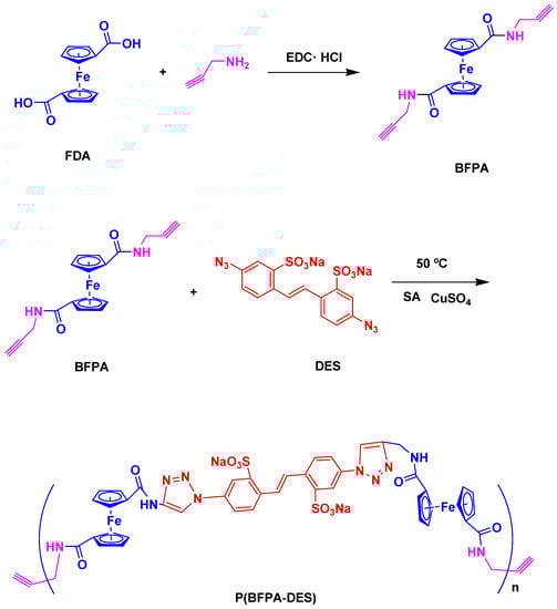 Liu et al. [] developed a simple and cost-effective electrochemical sensing platform approach through the click polymerization technique for the determination of AFB1. For this sensing approach, bis-ferrocenoyl propargylamide (BFPA) was synthesized using the chemical method. Thereafter, P(BFPA-DES) was prepared by click polymerization of BFPA and disodium salt tetrahydrate (DES) (Scheme 1). The azide group, which was attached at the end of c-DNA, covalently formed a bond with attained electroactive polymer P(BFPA-DES). For AFB1, aptamer acted as a capture probe, which further self-assembled over the surface of the Au electrode through Au–S bonding. When azide groups were modified, the complementary DNA (c-DNA) was hybridized with the aptamer, and click chemistry was responsible for the inclusion of polymer. The obtained electrochemical aptamer sensor exhibited great selectivity, sensitivity, and reliability for analysis of AFB1 in real samples with potential applications in the area of food safety and hygiene.