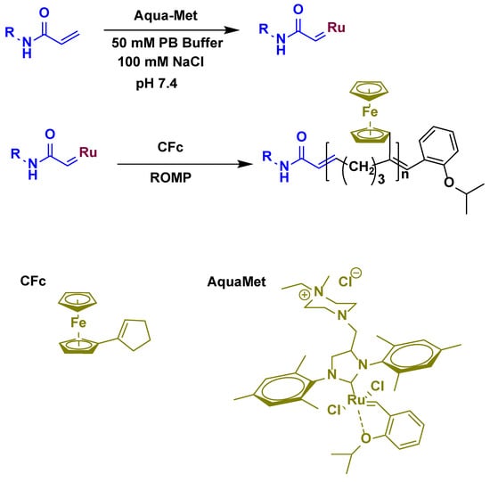 For the detection of AFB1, Yang et al. [] also fabricated an electrochemical sensor via ring-opening metathesis polymerization (ROMP) (Scheme 2). For the synthesis of the sensor, the Au electrode was immobilized with aptamer and AFB1 specific antibody, followed by grafting of cyclopentenyl ferrocene units using AquaMet catalyst, which resulted in the formation of long chain polymeric electroactive structure. This developed polymeric electro-sensor exhibiting a LOD of 0.34 fg/mL with a linear detection range of 2 fg/mL to 2 ng/mL. The prepared sensor was highly specific and selective because of the excellent interaction of the target with aptamer and antibody. In addition, the developed sensor exhibited an excellent tendency for quantification of AFB1 in real samples with 92.91% to 107.20% recovery.