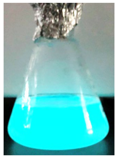 The bioluminescent bacteria strain Photobacterium phosphoreum was provided by Nanjing Institute of Soil Science, Chinese Academy of Sciences. The method of preparing bacterial suspension with bioluminescence was principally based on the steps previously described [23,24]. When strong greenish bioluminescence became observable to eye inspection, as shown in Figure 1, the bacterial suspension was diluted with another 100 mL liquid medium prior to usage.