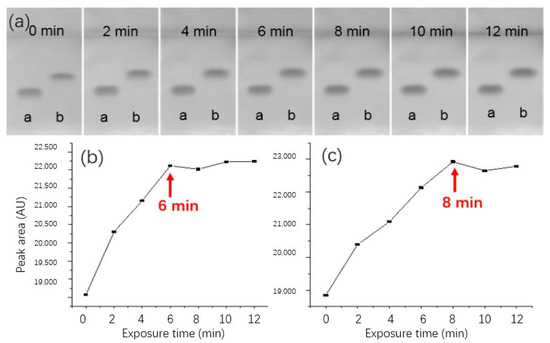 (a) The change of bioluminescent inhibition pattern within the initial 12 min after dipping. Track assignment: a—BZF, b—CPF; corresponding peak area variation profile for (b) BZF and (c) CPF.
