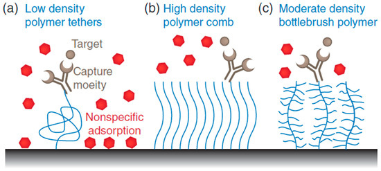 Figure 2. Schematic demonstration of the various surface grafting types of polymers. (a) Antibody grafted on a linear polymer and attached to a surface (at low density) enhances flexibility and allows access for capturing target molecules. There is a risk for non-specific attachment of other molecules on the empty gaps (fouling). (b) Polymer comb structure made from densely packed linear and hydrophilic polymers to produce antifouling effects. The attachment of targeting molecules will have better specificity. (c) Branched bottlebrush polymers are used at lower densities and demonstrate a better antifouling feature than linear polymers.
