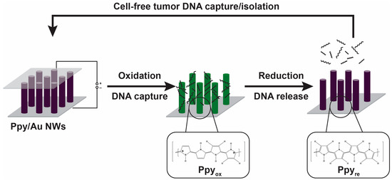 In addition to these mechanisms, polymeric materials can be functionalized with specific ligands or antibodies to capture specific analytes selectively. This can be accomplished through chemical reactions or physical adsorption to attach the ligands or antibodies to the polymer. For example, a polymer with a high surface area and a functional group compatible with the ligand or antibody may be used to capture the analyte via hydrogen bonds or van der Waals forces (noncovalent interactions). Poly(amidoamine) (PAMAM) is a dendrimer frequently used for multivalent recognition and entrapment of CTCs [29,30,31,32,33,34]. The detachment of antibody-decorated PAMAM dendrimers from epithelial cell adhesion molecules (EpCAMs) compared to the antibody alone were found to be 106 times smaller, providing higher capture density and efficiency [33,35]. Jeon et al. developed a new platform using nanostructured conductive polymer polypyrrole (Ppy) to capture and release circulating cell-free DNA (cfDNA) efficiently in unprocessed plasma samples of breast and lung cancer [36]. The developed platform used a polymer-coated gold nanowires structure to trap and isolate cfDNA, followed by the induction of polymer breakage (via an electrical potential) to release the cfDNA (Figure 3).