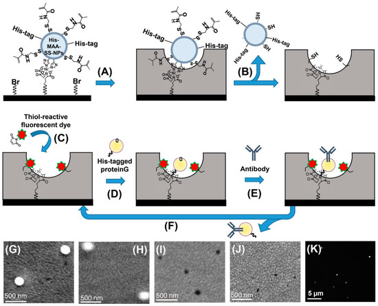 Figure 4. Molecular imprinting of detection cavities conjugated with specific antibodies for detecting intact small extracellular vesicles (sEVs). Nanoprocess of a biocompatible polymer matrix mold creation by immobilization of His-tags over silica nanoparticles (A) and their removal (B) to create sEV-binding cavities. Post-nanoprocessing via different chemical reactions, including the introduction of fluorescent dyes (C), His-tagged protein G (D), oriented protein G-based attachment of antibodies (E), and regeneration of sEV cavities (F). Scanning electron microscopic (GJ) and fluorescence (K) pictures of the different molding steps. Reused with permission from Ref. [37]. ©2020 American Chemical Society.