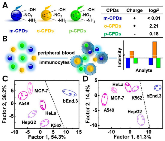 To investigate the potential of polymer dots in the detection of cancer cells, Liu et al. created a sensor for breast cancer diagnosis based on carbon polymer dots (CPDs) in peripheral blood cells [2]. Three polymer structures, including m-Phenylenediamine (mPD), o-phenylenediamine (oPD), and p-phenylenediamine (pPD), were selected for fluorescent synthesis of CPDs and detection of tumor-bearing mice. These CPDs have different surface chemistries, luminescence properties, and functional groups that can be accumulated on the surface of peripheral blood immunocytes. Furthermore, the accumulation of CPDs has led to significant changes in fluorescence intensity due to differences in electronegativity and the proportion of hydrophobic and hydrophilic components on the cell surface. The data collected through linear discriminant analysis (LDA) and hierarchical clustering analysis (HCA) illustrated enhanced precision and strong differentiation of mice with and without tumors (Figure 5).