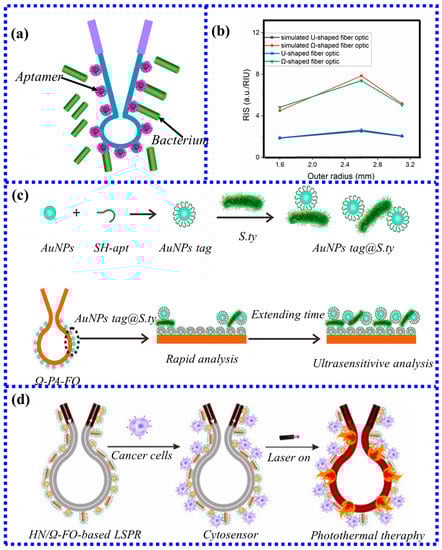 - Li, Y.; Wang, X.; Ning, W.; Yang, E.; Li, Y.; Luo, Z.; Duan, Y. Sandwich method-based sensitivity enhancement of Ω-shaped fiber optic LSPR for time-flexible bacterial detection. Biosens. Bioelectron. 2022, 201, 113911. [Google Scholar] [CrossRef]