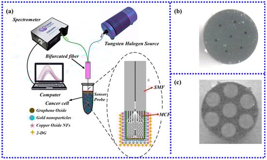 - Singh, R.; Kumar, S.; Liu, F.-Z.; Shuang, C.; Zhang, B.; Jha, R.; Kaushik, B.K. Etched multicore fiber sensor using copper oxide and gold nanoparticles decorated graphene oxide structure for cancer cells detection. Biosens. Bioelectron. 2020, 168, 112557. [Google Scholar] [CrossRef] [PubMed]