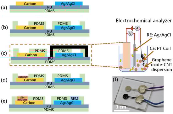 Fabrication process flow of the stretchable electrochemical sweat sensor: (a) Screen printing of the Carbon and Ag/AgCl layers on a PU-PDMS substrate; (b) Screen printing an additional PDMS layer to act as the electric insulator; (c) Electrochemical deposition of the Graphene–CNT layer at −1.22 V using an electrochemical analyzer, with the protection of the screen-printed reference electrode on the substrate by tape; (d) the 3D Graphene–CNT layer was formed on the screen-printed carbon electrode; (e) Forming the ISM by the drop-casting method; (f) The fabricated sensor bonded with wires.