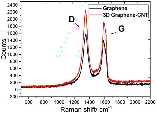 Figure 2 shows the comparison of the Raman spectra between the 3D graphene and the 3D Graphene–CNT network. The Raman spectrum of both spectra include the D-band at 1310 cm−1 attributed to an sp2 hybrid carbon atom vibration, associated with graphene edges or some disorder in the graphene structure, and the G-band at 1586 cm−1—attributed to the in-plane vibration of the sp2 carbon atoms.