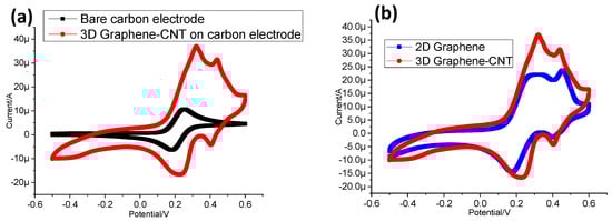Comparison of the electrochemical surface area of the 3D Graphene–CNT-deposited electrode with that of the (a) bare carbon electrode and (b) 2D Graphene-deposited electrode, respectively.