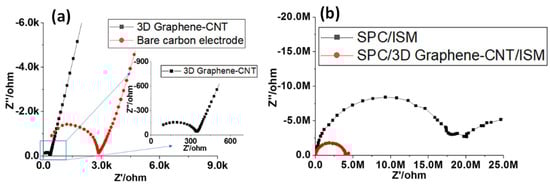 In Figure 5a, the EIS results for the 3D Graphene–CNT modified electrode showed a reduced diameter of the semicircle compared to that of the bare carbon electrode, suggesting that the surface of the 3D Graphene–CNT modified electrode exhibited a lower electron transfer resistance and an increased electron transfer rate. In addition, the steeper slope at lower frequencies of the 3D Graphene–CNT modified electrode indicated a higher double layer capacitance. Figure 5b plots the EIS results of the different electrodes coated with an ion-selective membrane (ISM) made of NH4+, in which the ions move into the ISM phase and electrons travel through the Graphene–CNT layer to reach the electrode. The reduced diameter of the semicircle on the EIS of the 3D Graphene–CNT modified electrode with ISM also indicates a lower Rct compared with that of the bare carbon electrode with the ISM. Thus, a more effective ion-to-electron transduction has been demonstrated using high-surface-area carbon materials, e.g., 3D Graphene–CNT. The EIS results were also fitted and verified by the equivalent circuit model (See Supplementary Materials Figure S3 and Table S1), in which the value of the Rct—with regards to the 3D Graphene–CNT modified electrode with the ISM (~5.8 × 106 Ω)—was much reduced compared to that of the bare carbon electrode with the ISM (~1.47 × 107 Ω).