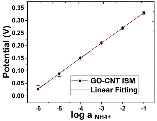 The potentiometric response to a series of testing solutions with NH4+ concentrations from 10−6 M to 10−1 M using a sensor with working electrodes modified by Graphene–CNT with an NH4+ ISM coating.