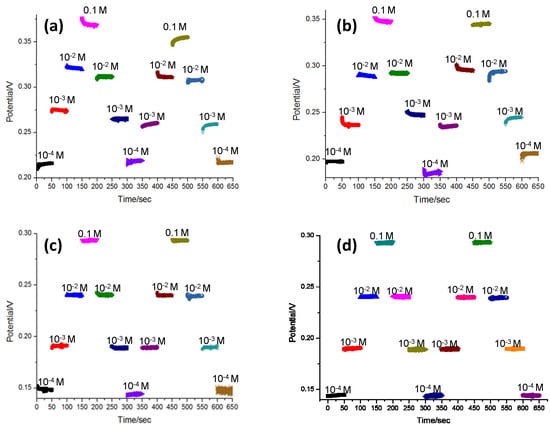 The reversibility of the potentiometric NH4+ detection using sensors (a,b) without and (c,d) with 3D Graphene–CNT modified electrodes, respectively.