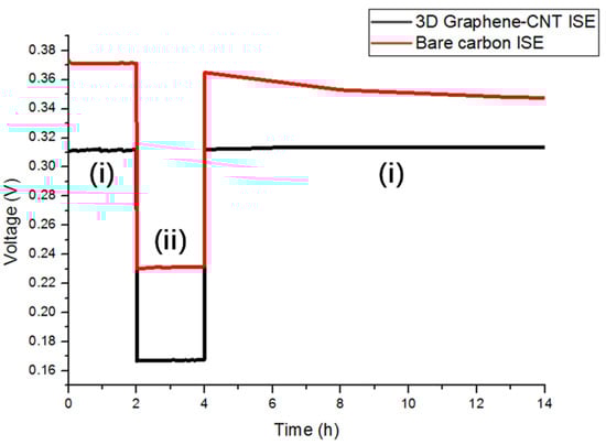 In order to confirm the presence of an aqueous layer between the ISM and carbon electrode layer, the potentiometric water layer test was carried out according to the following steps [22]: First, the electrodes were immersed in a 0.1 M NH4Cl solution of the primary ion for 2 h. After this, the testing solution was changed to 0.1 M NaCl for another 2 h. At the end, the solution was changed back to the initial solution of 0.1 M NH4Cl. The potential of the electrodes was continuously monitored during the whole process. As shown in Figure 8, there was a clear drift in the output potential of the sensor with only the bare carbon electrode, which was attributed to the formation of a water layer [23]. Under the same conditions, the sensor with the 3D Graphene–CNT electrode exhibited a stable potential output. This result thus illustrates that stability of the 3D Graphene–CNT electrode, which likely minimizes the formation of an aqueous layer between the ISM and the carbon electrode layer. This result also suggests that the hydrophobic properties of the proposed ISM could effectively minimize the leaking of ISM components, which enhances the stability of the sensor’s potential output.