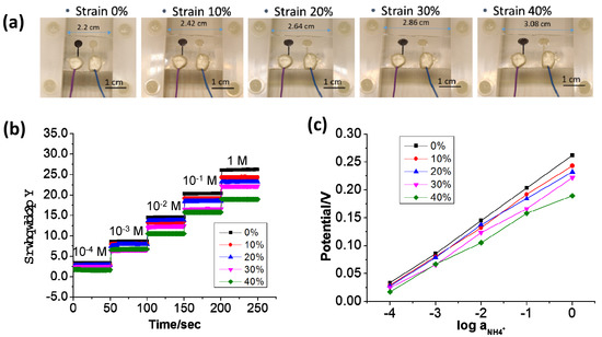 Figure 10a shows the photographs of the 3D Graphene–CNT modified sweat sensor under different levels of strain (0% to 40%) on the PU/PDMS substrate, on which the sensor still adhered well—although with certain deformations. Figure 10b plots the potentiometric output as a function of NH4+ concentrations from 10−4 M to 1 M under different levels of strain. Compared with the potentiometric output shown in Figure 8d of the sensor with only the PDMS substrate, that of the sensor on the PU/PDMS substrate still looked stable—even at a strain of as high as 40%. Figure 10b plots the potentiometric output of the sweat sensor under a series of NH4Cl solutions with different concentrations (10−4 M to 1 M), in which the output signal looks very stable. Figure 10c plots the curves of the averaged potentiometric output as a function of the concentration of NH4+. The curves are generally linear, even under the highest strain level of 40% (Min R2 = 0.9108). Under a strain of 40%, the sensor still turned out to have a sensitivity of 42.7 ± 3.1 mV/log [NH4+]. The stretchability test provides evidence that the Graphene–CNT ion-selective membrane is structurally stronger than the bare carbon ion-selective membrane, which could still work stably under a 40% strain—indicating that leakage issues are not significant here.