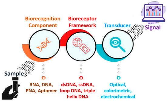 The capture probe’s design is unquestionably the crucial preanalytical stage because the hybridization response’s specificity relies mainly on the bioreceptor element’s capabilities to seize oligonucleotides. The creation of linear probes uses a variety of commercially accessible firmware that may create detention of oligonucleotides inside highly conserved or hypervariable areas of various genomes following their assembly and alignment. Final tests include employing a basic local alignment search tool (BLAST) to check candidate sequences for homologies, theoretical melting temperature, dimer formation, and length (18–24 nucleotides) [76,77,78,79].